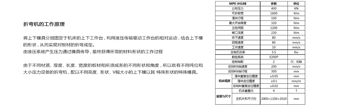 產品特點: MPS-0416B為2軸集成數控折彎機 , 采用先進的控制系統、進口成套液壓系統、機械液壓同步機構 , 運行平穩、精度高、噪音低。