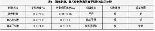 ③材料經(jīng)過激光切割后,熱影響區(qū)寬度很小,切縫附近材料的性能也幾乎不受影響,并且工件變形小,切割精度高,切縫的幾何形狀好,切縫橫截面形狀呈現(xiàn)較為規(guī)則的長(zhǎng)方形。激光切割、氧乙炔切割和等離子切割方法的比較見表1,切割材料為6.2mm厚的低碳鋼板。