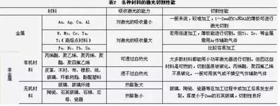 金屬基復(fù)合材料、皮革、木材及纖維等。但是對(duì)于不同的材料,由于自身的熱物理性能及對(duì)激光的吸收率不同,表現(xiàn)出不同的激光切割適應(yīng)性。采用CO2激光器,各種材料的激光切割性能見表2。